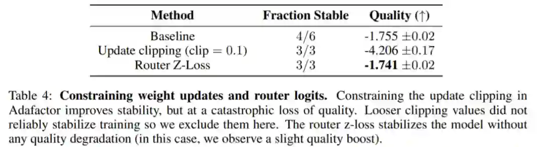 下表 4 显示,在三次运行中,update clipping 和 router z-loss 都稳定了模型,但是 update clipping 严重影响了模型的质量。因此,研究者使用 z-loss 方法来固定模型稳定性。