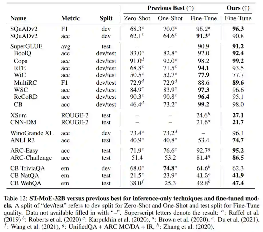 这篇论文的目的就是提高稀疏模型的实用性和可靠性。他们研究了这两个问题,并给出了设计指南。最后,他们将稀疏模型的参数缩放到 269B,其计算成本与 32B 密集编码器 - 解码器 Transformer(稳定、可迁移的 Mixture-of-Experts、ST-MoE-32B)相当。这是稀疏模型首次在迁移学习中实现 SOTA 性能,跨越了一系列不同的任务,包括推理(SuperGLUE、ARC Easy、ARC Challenge)、摘要(XSum、CNN-DM)、闭卷问答(WebQA、Natural Questions)和对抗式构造任务(Winogrande、ANLI R3)。