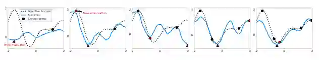 这些图展示了5次迭代优化的过程。每个预测函数(蓝色)是通过对一个潜变量(latent variable)的采样来绘制的,其中该变量的条件是增加文本节点(黑色)的数量。底层的ground truth函数被表示为一条黑色虚线。红色三角形表示下一个评估点(evaluation point),它对应于抽取的NP曲线的最小值。下一个迭代中的红色圆圈对应于这个评估点,它的底层ground truth指将作为NP的一个新文本节点。