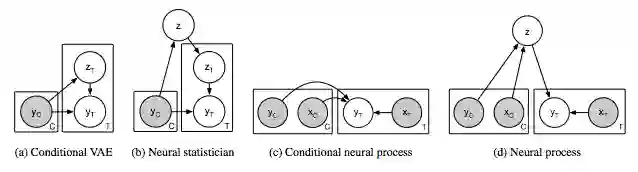 图2:相关模型(a-c)和神经过程(d)的图模型。灰色阴影表示观察到变量。C表示上下文变量,T表示目标变量,即给定C时要预测的变量。