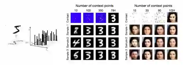 左边的图展示了一张图像完成像素化可以框定为一个2-D回归任务,其中f(像素坐标)=像素亮度。右边的图展示了图像实现MNIST和CelebA的结果。顶部的图像对应提供给模型的上下文节点。为了能够更清晰的展现,未被观察到的点在MNIST和CelebA中分别标记为蓝色和白色。在给定文本节点的情况下,每一行对应一个不同的样本。随着文本节点的增加,预测像素越来越接近底层像素,且样本间的方差逐渐减小。