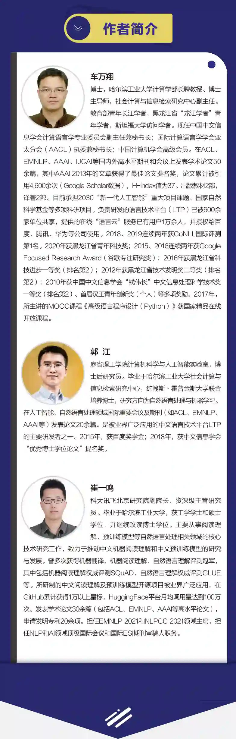 本书由哈工大社会计算与信息检索研究中心(SCIR)多位学者编写,由哈工大社会计算与信息检索研究中心(SCIR)副主任车万翔教授、麻省理工大学(MIT)计算机科学与人工智能实验室博士后研究员郭江博士、科大讯飞北京研究院副院长崔一鸣编著,由哈工大计算学部主任刘挺教授主审。本书既适合具有一定机器学习基础的高等院校学生、研究机构的研究者,以及希望深入研究自然语言处理算法的计算机工程师阅读,也适合对人工智能、深度学习和自然语言处理感兴趣的学生和希望进入人工智能应用领域的研究者参考。