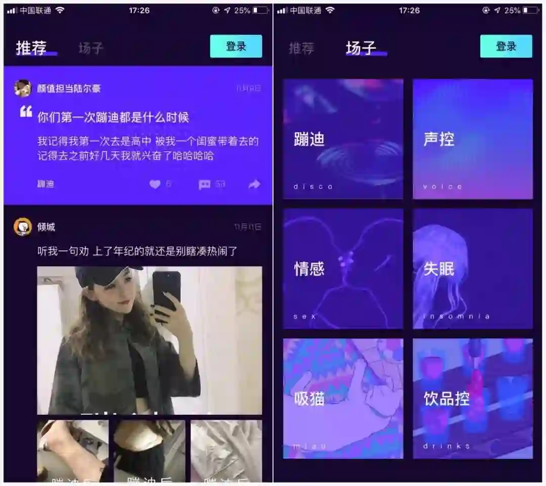 据「蹦迪」官方介绍表示,这是一款立志为年轻群体打造专属潮流文化社区的产品,介绍词为:“你的躁动并不孤独”。产品主页面秉承了快手一贯的直接明了易上手的特性,整体呈现夜店灯光的迷幻色彩,贴近年轻人追求的潮流、炫酷效果。