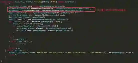 SDK中导致漏洞的代码是WXPayUtil工具类中的xmlToMap()方法: