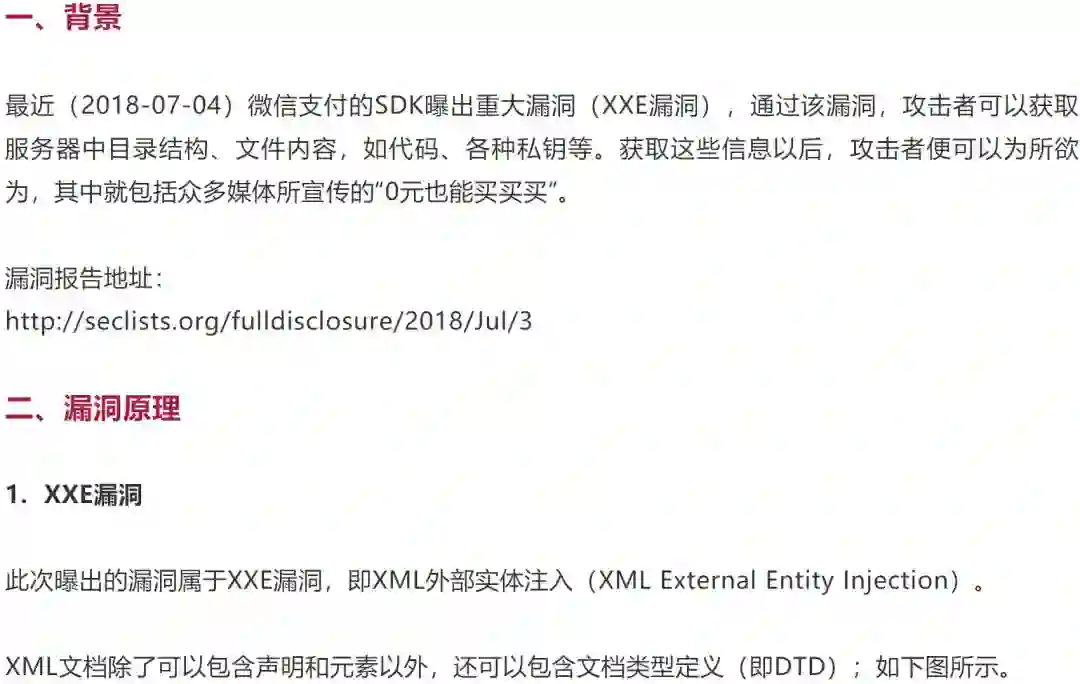 可以说,XXE漏洞之所以能够存在,本质上在于在解析XML的时候,可以与外部进行通信;当XML文档可以由攻击者任意构造时,攻击便成为可能。在利用XXE漏洞可以做的事情当中,最常见最容易实现的,便是读取服务器的信息,包括目录结构、文件内容等;本次微信支付爆出的漏洞便属于这一种。
