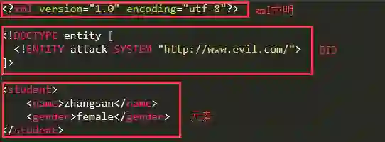 在DTD中,可以引进实体,在解析XML时,实体将会被替换成相应的引用内容。该实体可以由外部引入(支持http、ftp等协议,后文以http为例说明),如果通过该外部实体进行攻击,就是XXE攻击。