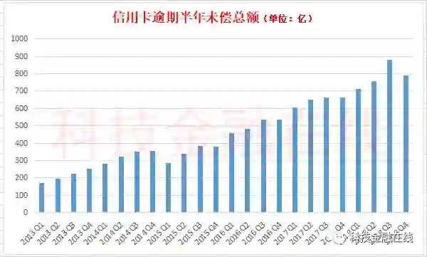 伴随人们使用信用卡透支消费的急剧增长,信用卡违约坏账也在加速增长。2015年底,央行公布的信用卡逾期半年未偿金额为337亿,到了2018年底,已经增长到788亿,在2018年第三季度,这一数字一度高达880亿。