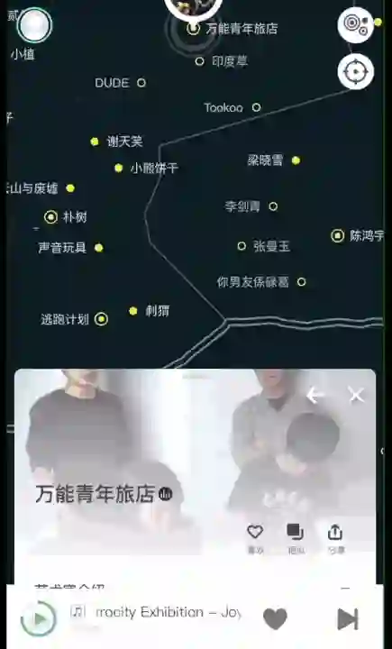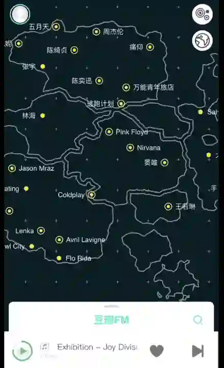 体验新版本时候,笔者还有一个重大发现——关于如何引导用户发现更多艺术家这件事情上,豆瓣 FM 有了新的玩法——据过往的豆瓣音乐轨迹生成的音乐地图。这款应用首页下拉后,你可以对缩放地图上各个区域的音乐人聚类进行探索,也可以从任意一点开始,发现与之最相似的音乐人——他们或许在你完全陌生的地图另一端。