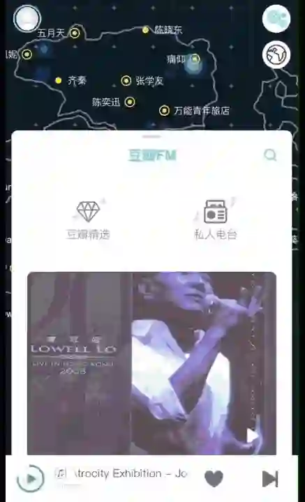 打开豆瓣 FM 首先展示的是「主卡片」:豆瓣精选、私人电台以及一些针对个人听音喜好的推荐;收起卡片后点击左上角的头像会展开侧栏,选择打开「自己的红心歌曲」「收藏的唱片」或者「收藏的歌单」——毫无例外,这些展开都是一个个「音乐卡片」。不过这次最抢眼的视觉改变到还不是 UI 和 UV 方面的,改变是来自一份音乐地图。地图由不同年代、不同地区、不同流派的音乐创作者组成,经由豆瓣音乐大数据算法构建而出。它是千万豆瓣用户的音乐口味的集体映射,你也可以根据你自己的豆瓣音乐足迹,生成到一份你独一无二的音乐地图——蓝绿色(喜欢)与灰色(不喜欢)反映了你自己的音乐喜好;而随着你音乐口味的变化,地图也会发生改变。