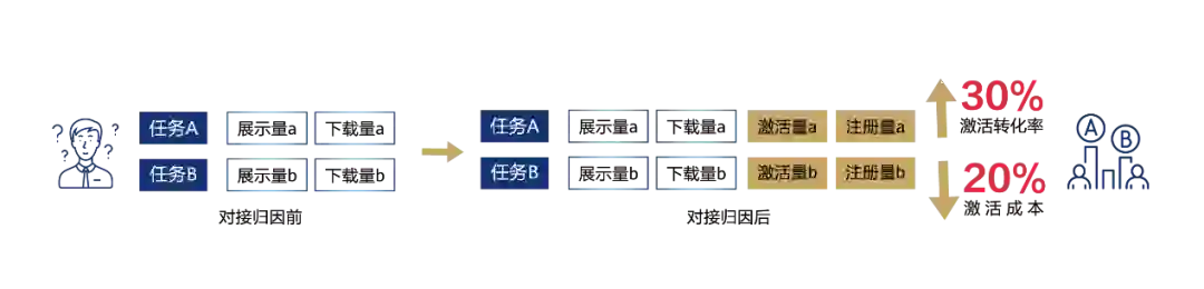 最早,是以Facebook广告平台为代表的信息流渠道提供了归因能力,而近两年来,应用商店也在持续开放归因能力。其中,华为应用市场率先开放归因能力,并提供智能分包和监测链接两种归因工具,已助力上百名广告主看清每个推广任务的后端效果。从某视频应用广告主了解到,其在华为应用市场开放归因功能之前,难以看清每个广告计划的后端效果,一直苦于粗略的数据分析无法带来更深层次地改进。在对接归因之后,其能清晰地看到了每条任务的深层数据,如任务A的用户注册率较高,任务B的用户打开激活情况更好等。该广告主结合投放数据与自身的考核指标,相应地调整广告任务结构以及出价和预算,提升精细化运营程度。经过一段时间的优化后,应用的转化率提升30%+,成本降低近20%,真正做到了降本增效。