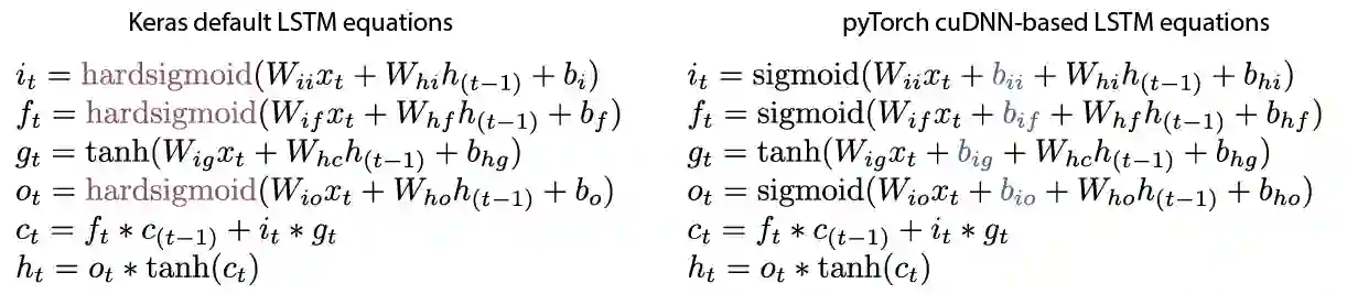 该模型是使用针对LSTM的回归内核的Theano/Keras默认激活函数hard sigmoid训练的,而pyTorch是基于NVIDIA的cuDNN库建模的,这样,可获得原生支持LSTM的GPU加速与标准的sigmoid回归激活函数: