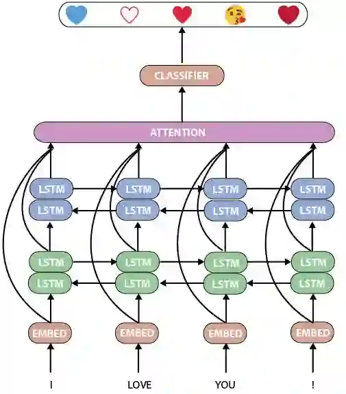 首先,我们来看看torchMoji/DeepMoji的模型。它是一个相当标准而强大的人工语言处理神经网络,具有两个双LSTM层,其后是关注层和分类器: