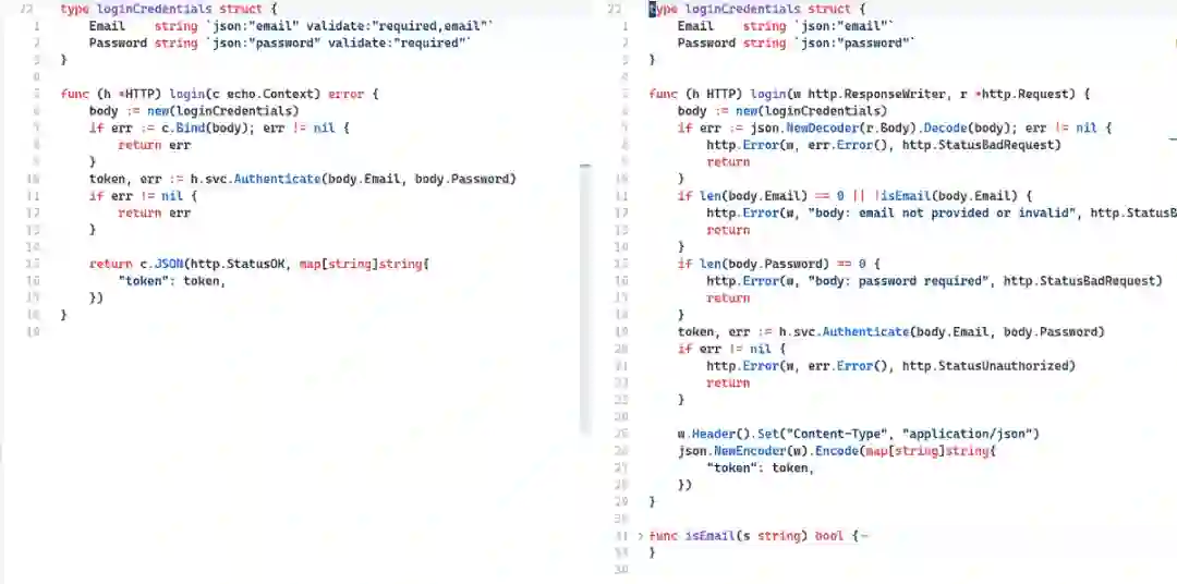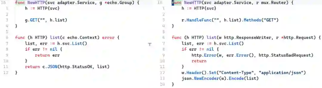 我还发现,用 echo 编写应用程序时有一些比较精简的样板(主要是解析 json body、编写 errors 以及手动设置 headers 等),让代码的可读性有所提高。