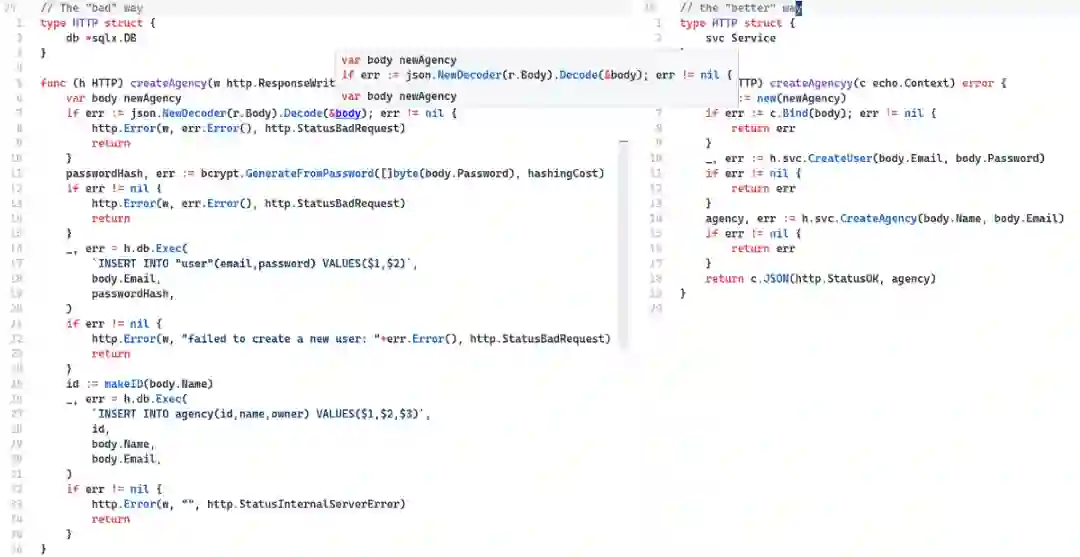 关于 Go 的问题是,你很容易跳过关于构建代码结构的学习,使得代码很难阅读和维护。如果你还不知道我在说什么,下面是我不久前写的一个(糟糕的)Go 端点例子: