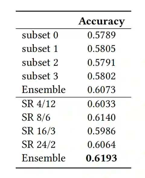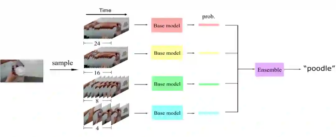 集成学习可以显著提高模型在各类任务中的表现,其中基于降低方差方法的核心之一在于需要不同的基学习器从数据中学习到不同的知识,从而通过不同基学习器的共识提高最终的泛化性能。Bagging [13] 就是其中的代表算法之一。我们从 Bagging 的思想出发,区别于原算法中通过随机采样训练子集的方式,我们使用不同的时域采样率采样视频,得到不同时域分辨率的训练集合,从而训练不同的基学习器。实验证明我们的方法可以显著提高集成的效果,同时,由于每个基学习器都能使用全部的训练视频,进而取得更高的单模型性能,我们的方法也优于传统的 Bagging 集成策略。