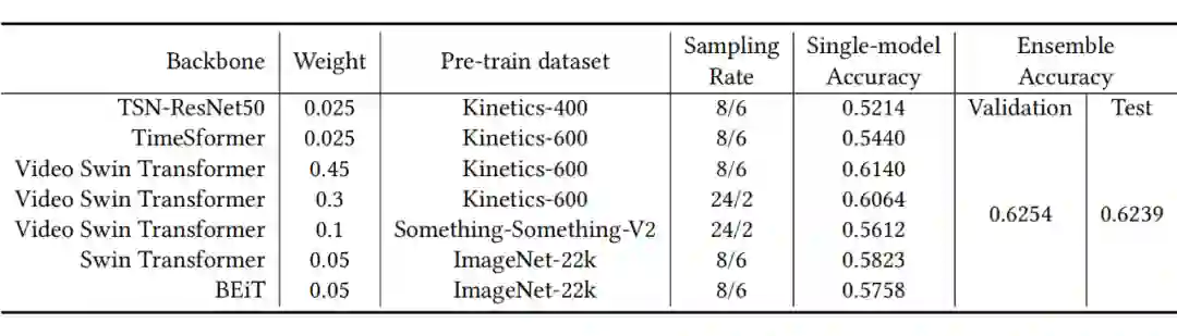 在最终的提交方案中,我们将七种各自具有不同的网络结构、不同的预训练数据集以及不同的采样率的模型集成,得到了最优的测试集 top-1 精度 62.39,最终得到了本次比赛视频分类赛道的第一名。