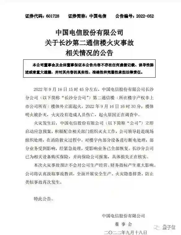 就长沙第二通信楼火灾事故,中国电信已发布正式回应公告。