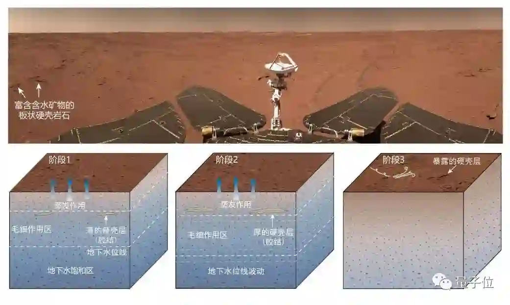 通过相机影像和光谱数据,在着陆区附近的板状硬壳岩石中发现含水矿物,证明了在距今10亿年(晚亚马逊纪时期)以来,着陆区存在过大量液态水活动。
