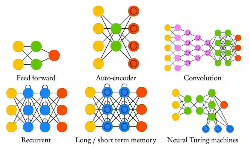 其中,图 1 展示了深度神经网络常用的架构,即前馈网络、自编码器、卷积网络、循环网络、长短期记忆和神经图灵机。一旦系统训练得出了一个高阶非零权重矩阵,其中就暗含了一个神经网络结构。