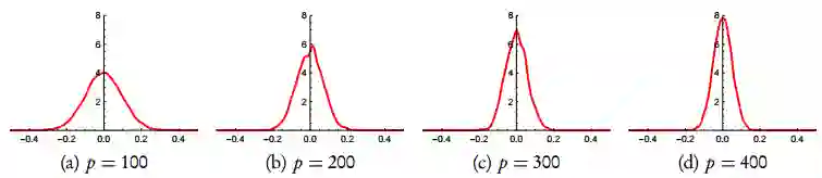 图 4:Y ∼ U(Bp) 的边缘分布直方图,其中 p 为不同的维度数量。