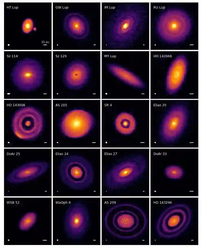 这些代表着行星形成区域的图像呈现出了各种各样的图案:有些是整齐的椭圆盘中夹着清晰的环状空带,有些则像微型的星系那样由旋臂组成开放的弧形。这些环绕恒星的原行星盘是行星的“摇篮”。