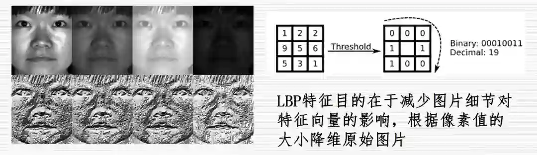 局部二值特征(Local Binary Pattern),再举一个人脸识别例子,深度学习出来之前,图片分类都是使用一些特征算子提取特征的。比如存在一个3x3的窗口,我们取阈值5,比5小的窗口置为0,其他的置为1,然后顺时针转换为一个8位的二进制数字,对应的十进制就是19。显然,LBP特征进行了一个降维的操作,左边的图片显示了人脸识别不应该受光照影响,不同光照的图片进行LBP特征提取后,显示结果都一样。