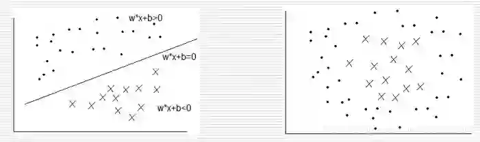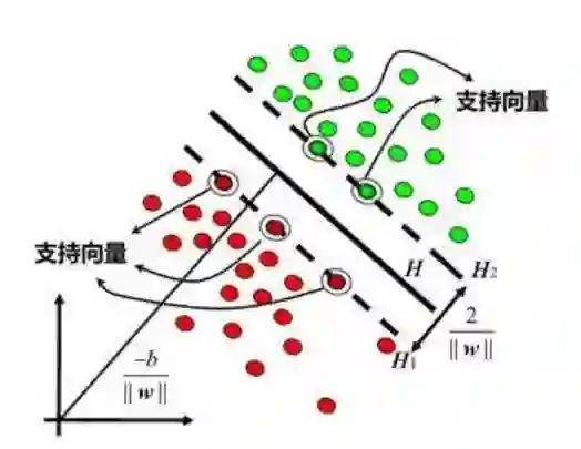 首先存在很多训练数据点,包括直线上方和下方两个簇,支持向量机的方法是寻找这两个簇分类的超平面。如何寻找这个超平面呢?支持向量机先求解每个簇离对面最近的点,然后通过拟合方法计算出两边簇的边界,最终计算出中间的平面,其基本思路就是这样,而这些点就是支持向量。支持向量机往往用来处理超高维的问题,也不一定是类似直线的平面,也可能是圆形的分类边界。