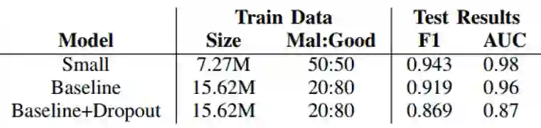 Fireeye使用了三个数据集进行训练和测试,其训练的模型分类效果结果如下表所示,博客Small、Baseline、Baseline+Dropout模型,其网络结构是一样的,其中Small表示使用小的数据集,Baseline表示使用大的数据集,Dropout表示对训练好的神经网络中随机丢弃一些神经元,从而抑制过拟合现象,也是比较常用的深度学习技术。