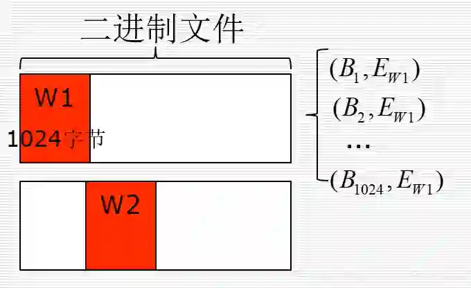 在下图中,假设白框是一个二进制文件,其中红色框W是滑动窗口,二进制文件如果有100KB大小,每个滑动窗口是1024字节,那么滑动100次可以将整个二进制文件扫描完。如果对窗口内的数值进行计算,首先计算它的熵值,熵是信息论的概念(下图中的E),它描述了一个数组的随机性,熵越大其随机性越大。在图中,每一个滑动窗口都有固定的熵值,包含了1024字节,标记为(Bi,Ewi),最后滑动得到100x1024的字节熵对。