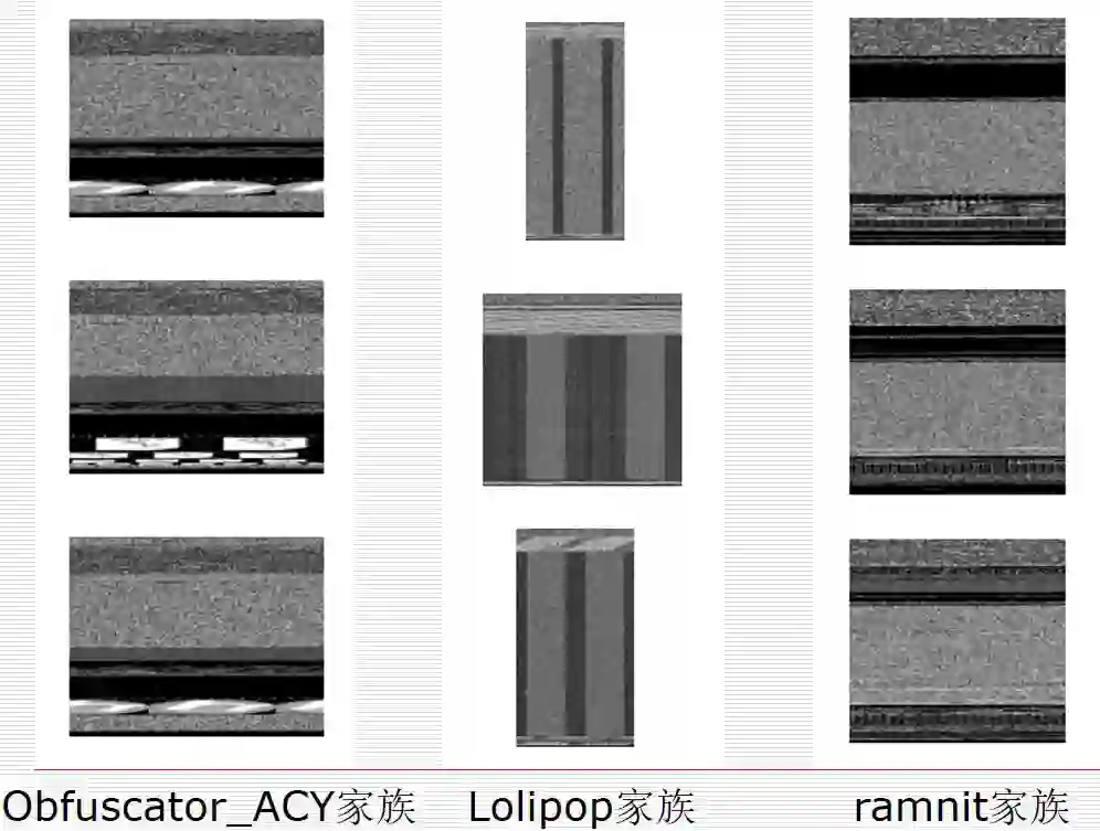 它的基本方法是按照每8位一个像素点将恶意软件的二进制文件转换为灰度图片,图片通常分为R、G、B通道,每个8位像素点表示2^8,最终每隔8位生成一个像素点从而转换为如下图所示的灰度图片。图片分别为Obfuscator_ACY家族、Lolipop家族、ramnit家族恶意软件样例,这些样例由微软kaggle比赛公布的数据生成。