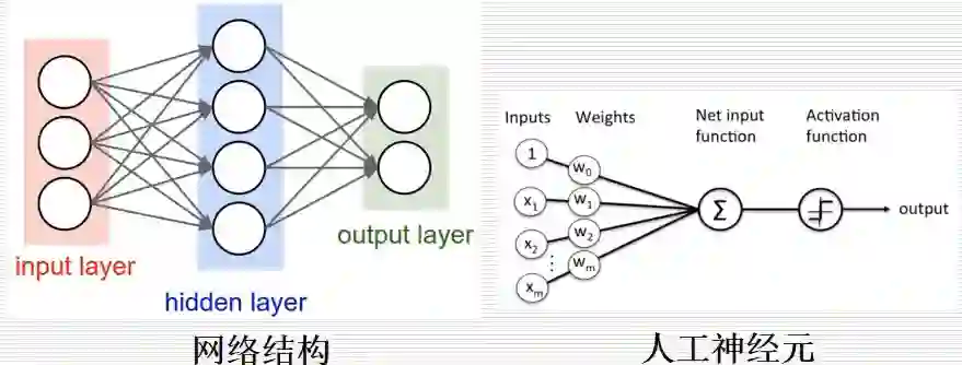 神经网络基本网络结构如下图所示,包括三个常用层:输入层、隐藏层、输出层。在神经网络中,最基本的单位是人工神经元,其基本原理是将输入乘以一个权重,然后将结果相加进行激活,最后得到一个概率的输出,其输出结果谁大就预测为对应的结果。