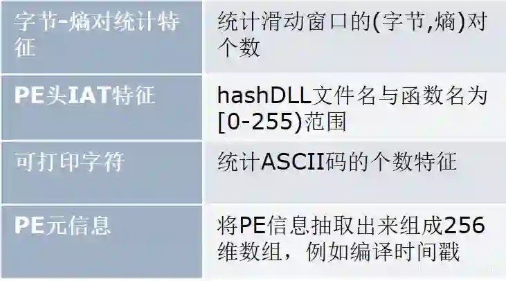 第二种特征是PE头IAT特征。它的计算工程是将PE头的IAT表里面的文件名和函数名hash到0到255范围,如果某个文件出现某个函数,就将该位置为1,当然每位对应表示的函数是固定的,最终得到256数组。