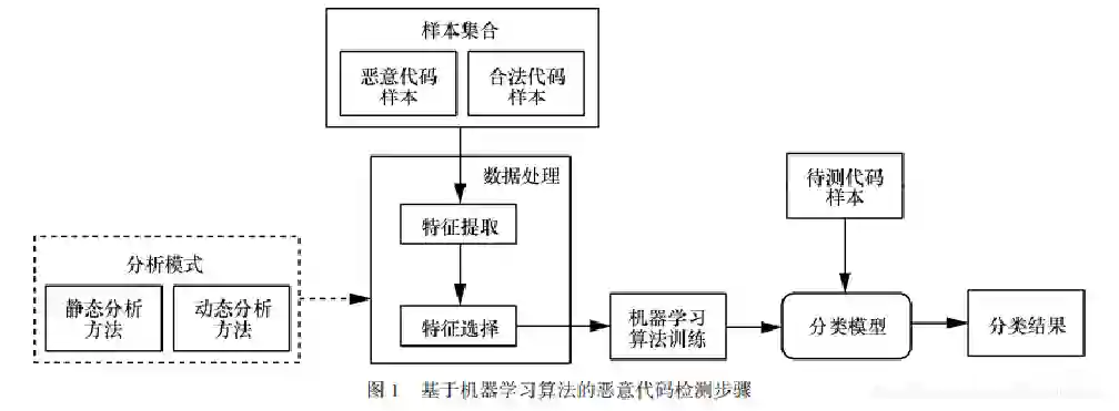 恶意代码的检测本质上是一个分类问题,即把待检测样本区分成恶意或合法的程序。基于机器学习算法的恶意代码检测技术步骤大致可归结为如下范式: