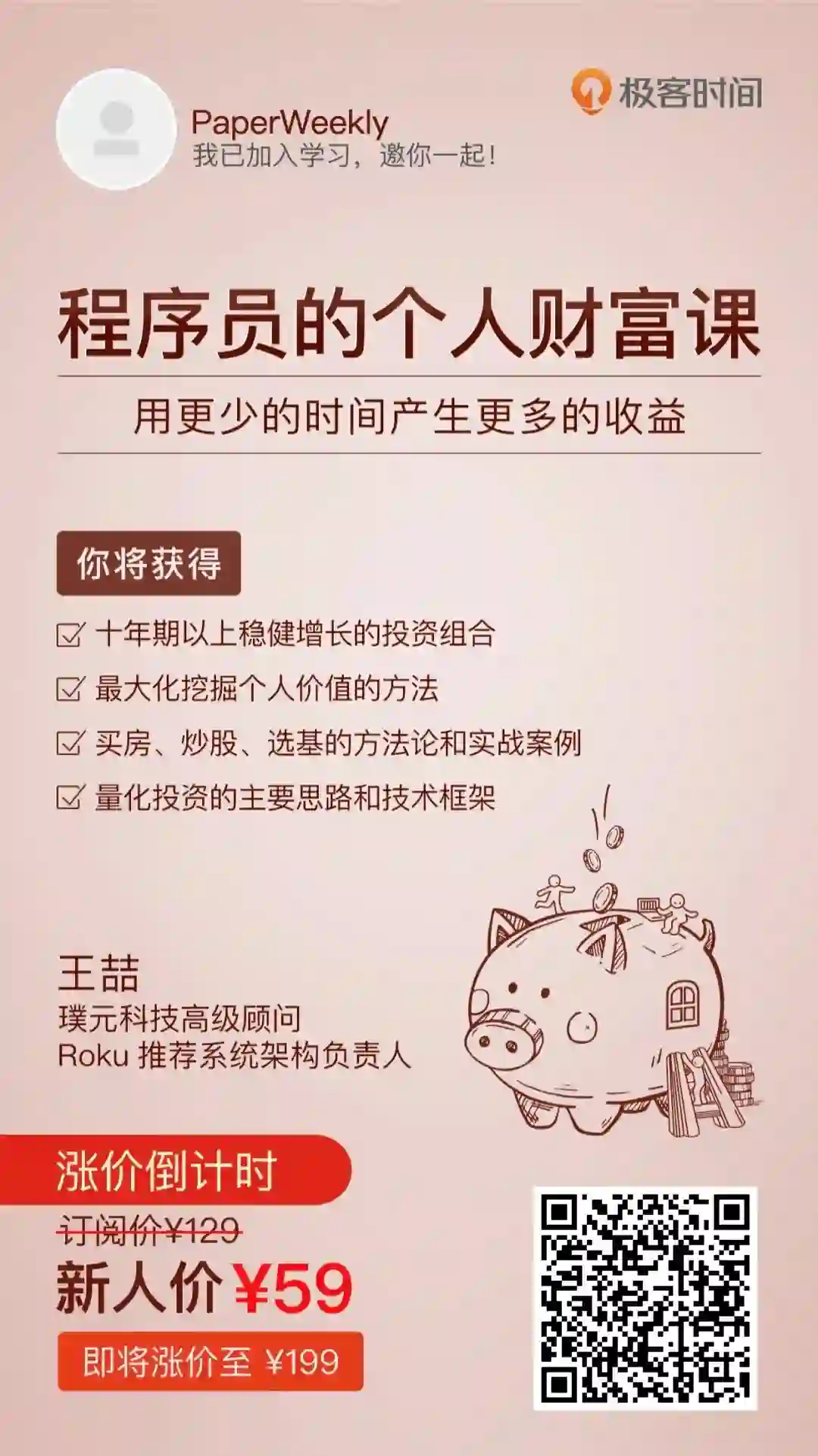 在专栏里,他从程序员角度出发,带你建立正确的财富观,搭建由“个人发展”和“投资理财”组成的稳固的财富框架。除此之外,还会教你如何规划职业发展道路,介绍买房、炒股、选基的方法论和实战案例,帮你用更少的时间产生更多的收益。