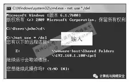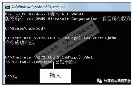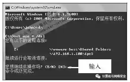 步骤8:删除IPC$连接,在“命令提示符”窗口的光标处输入net use\\IP\ipc$/del命令来断开IPC$连接,例如输入net use\\192.168.1.100\ipc$/del。
