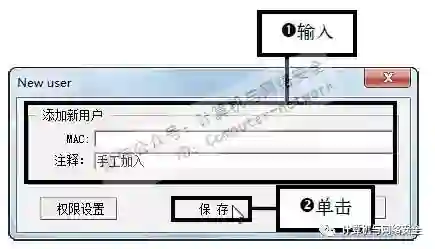 步骤22:输入新用户的MAC地址,弹出New user对话框,输入新用户的MAC地址,然后单击“保存”按钮。