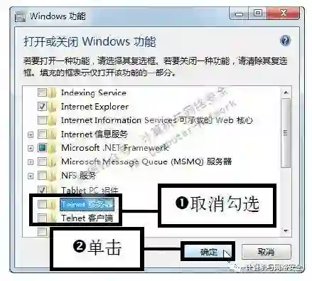步骤3:关闭Telnet服务端和客户端,弹出“Windows功能”对话框,在列表框中取消勾选“Telnet服务端”和“Telnet客户端”复选框,然后单击“确定”按钮。