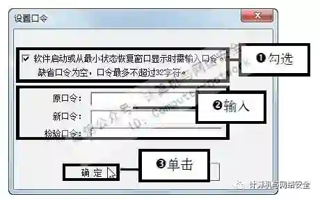 步骤6:设置口令,勾选“软件启动或从最小状态恢复窗口显示时输入口令”复选框,然后输入设置的口令,单击“确定”按钮。