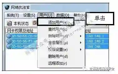 步骤21:单击“添加用户”命令,返回“网络执法官”主界面,在菜单栏中依次单击“用户>添加用户”命令。