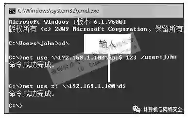 步骤5:建立映射,建立映射的命令格式为:net use z:\\IP\c$"Passwd"/user:"Admin"。其中\\IP\d$表示目标主机上的D盘,符号“$”表示隐藏的共享,"z:"表示将远程主机的D盘映射为本地磁盘的盘符。