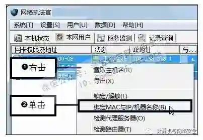 步骤19:单击“绑定MAC与IP/机器名称”命令,右击要绑定MAC-IP的计算机,在弹出的快捷菜单中单击“绑定MAC与IP/机器名称”命令。