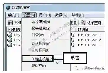 步骤9:单击“关键主机组”命令,返回“网络执法官”主界面,在菜单栏中依次单击“设置>关键主机组”命令。