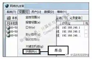 步骤11:单击“IP保护”命令,返回“网络执法官”主界面,在菜单栏中依次单击“设置>IP保护”命令。