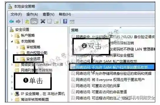 步骤4:设置安全选项,在“本地安全设置”窗口的左侧依次单击展开“安全设置>本地策略>安全选项”分支,然后在右边窗格中双击“网络访问:不允许SAM账户和共享的匿名枚举”选项。
