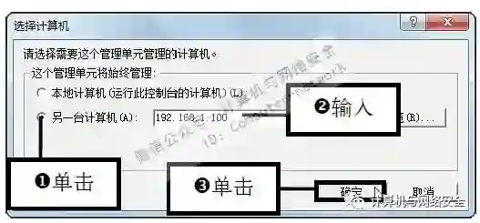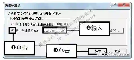 步骤10:输入目标计算机的IP地址,弹出“选择计算机”对话框,1 单击选中“另一台计算机”单选按钮,2 在其后的文本框中输入目标计算机的IP地址,例如输入192.168.1.100,3 然后单击“确定”按钮。
