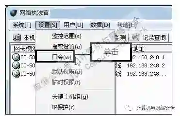 步骤5:单击“口令”命令,返回“网络执法官”主界面,在菜单栏中依次单击“设置>口令”命令。