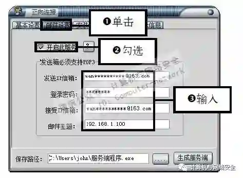 步骤6:设置邮件服务,切换至“邮件设置”选项卡,勾选“开启此服务”复选框,然后分别输入发送IP信箱、登录密码和接收IP信箱及邮件主题。