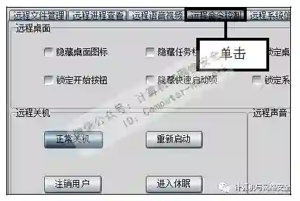 步骤15:利用远程命令控制目标计算机,切换至“远程命令控制”选项卡,在这里可对远程计算机进行桌面图标控制、开关机、死机黑屏以及改变声音等操作。