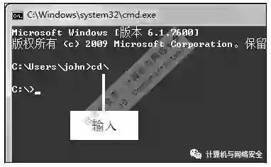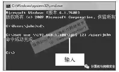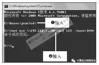 步骤1:建立IPC$连接,使用Telnet入侵首先需要建立IPC$连接,打开“命令提示符”窗口,在光标处输入cd\并按【Enter】键,然后再输入net use\\IP\ipc$"Passwd"/user:"Admin"命令建立连接。
