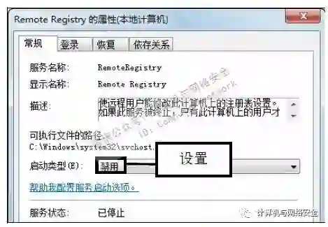 步骤3:设置启动类型为禁用,弹出“Remote Registry的属性(本地计算机)”对话框,在“启动类型”下拉列表中单击“禁用”选项,即禁用Remote Registry服务。